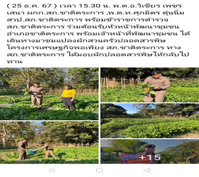 พ.ต.อ.วิเชียร เพชรเสนา ผกก.สภ.ชาติตระการ พร้อมข้าราชการตำรวจ สภ.ชาติตระการ ร่วมต้อนรับหัวหน้าพัฒนาชุมชนอำเภอชาติตระการ พร้อมเจ้าหน้าที่พัฒนาชุมชน ได้เดินทางมาชมแปลงผักสวนครัวปลอดสารพิษ โครงการเศรษกิจพอเพียง สภ.ชาติตระการ ซึ่งทาง สภ.ชาติตระการ ได้มอบผักปลอดสารพิษให้กลับไปรับประทาน